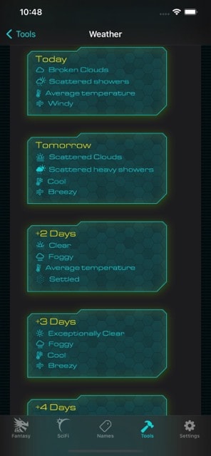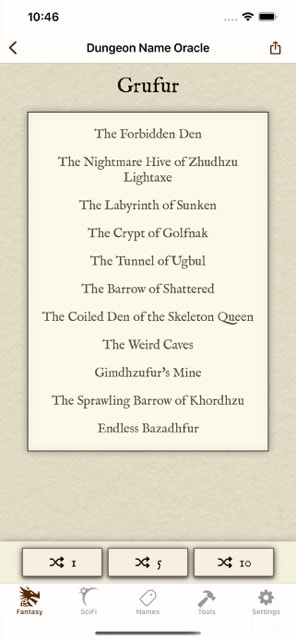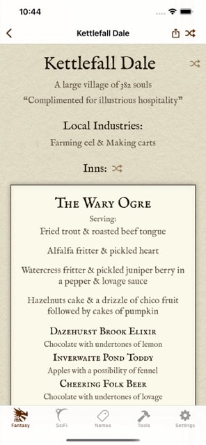 - Generate unique, interesting and believable names in an instant. Millions of possibilities- Action and Danger oracles provide inspiration for when you are stuck for ideas.- Generate adventure plot outlines, places and treasures- Inns, meals and beers. No more boring generic inns for your party to meet in!- Multi genre - Fantasy and Sci-Fi specific generators, and modern names from 9 different nationalities and regions. Genre specific themes included when unlocking a genre pack.- Believable and realistic weather generator, with precise climate settings.